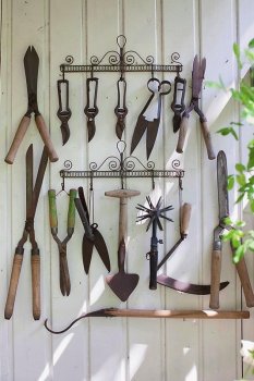 У вас в хозяйстве завалялись лопаты и тяпки «преклонного возраста»? Найдите «почетным пенсионерам» новое применение: например, декорируйте ими садовую калитку.Правда, есть один нюанс: чтобы защитить инвентарь от дальнейшей коррозии, инструменты нужно покрыть лаком, устойчивым к неблагоприятным погодным условиям, или окрасить. Старые садовые ножницы, серпы и ручные лопатки, подвешенные на гардеробных крючках, пригодятся для декора стены хозблока.